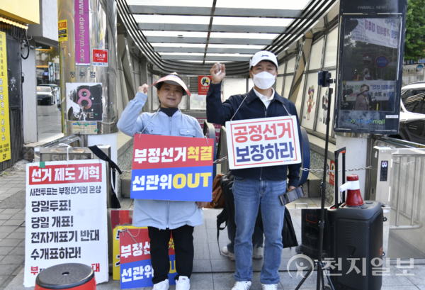 [천지일보 충북=김홍진 기자] 충북 부정선거부패방지대(부방대) 회원들이 2일 청주 성안길에서 “공정선거 보장하라”는 피켓 시위를 하고 있다.