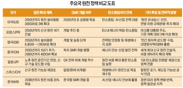 미국, 유럽, 중국, 일본 등 주요국이 탄소중립과 에너지 안보, 급증하는 전력 수요 대응을 위해 원전 확대 및 SMR(소형모듈원자로) 개발에 박차를 가하고 있다. 미국은 2050년까지 원전 설비용량을 3배로 늘릴 계획이며, 프랑스·중국·영국·일본도 대규모 신규 원전 건설과 기술 개발에 집중하고 있다.