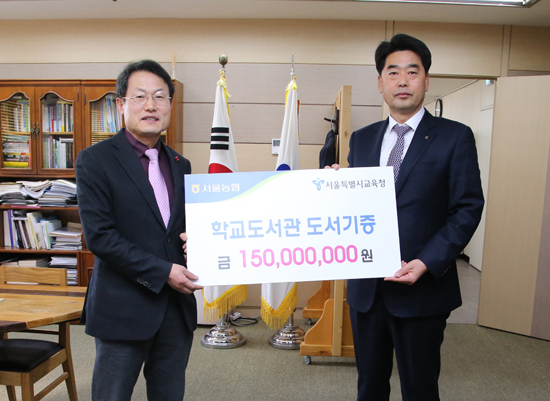 ▲ (사진제공: 서울시교육청) [천지일보=김민아 기자] 조희연 서울시교육감과 최옥 농협중앙회 서울지역본부장이 11일 오후 서울 종로구 서울시교육청에서 다문화학교, 대안교실, 오디세이학교 등의 독서교육 활성화를 위한 학교도서관 도서구입비 기부금 전달식 후 기념촬영하고 있다.
