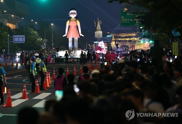 (서울=연합뉴스) 28일 서울 광화문 광장에서 ‘오징어 게임 시즌3’ 퍼레이드 행사가 진행되고 있다.