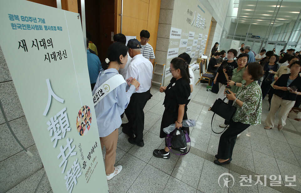 [천지일보=이시문 기자] 18일 오후 서울에서 한국언론사협회가 주최하고 천지일보가 주관한 ‘광복 80주년 기념 명사초청 특강’에서 참석자들이 입장하고 있다. 이번 특강은 ‘새 시대의 시대정신 人類共榮(인류공영)을 말하다’를 주제로 진행됐다.