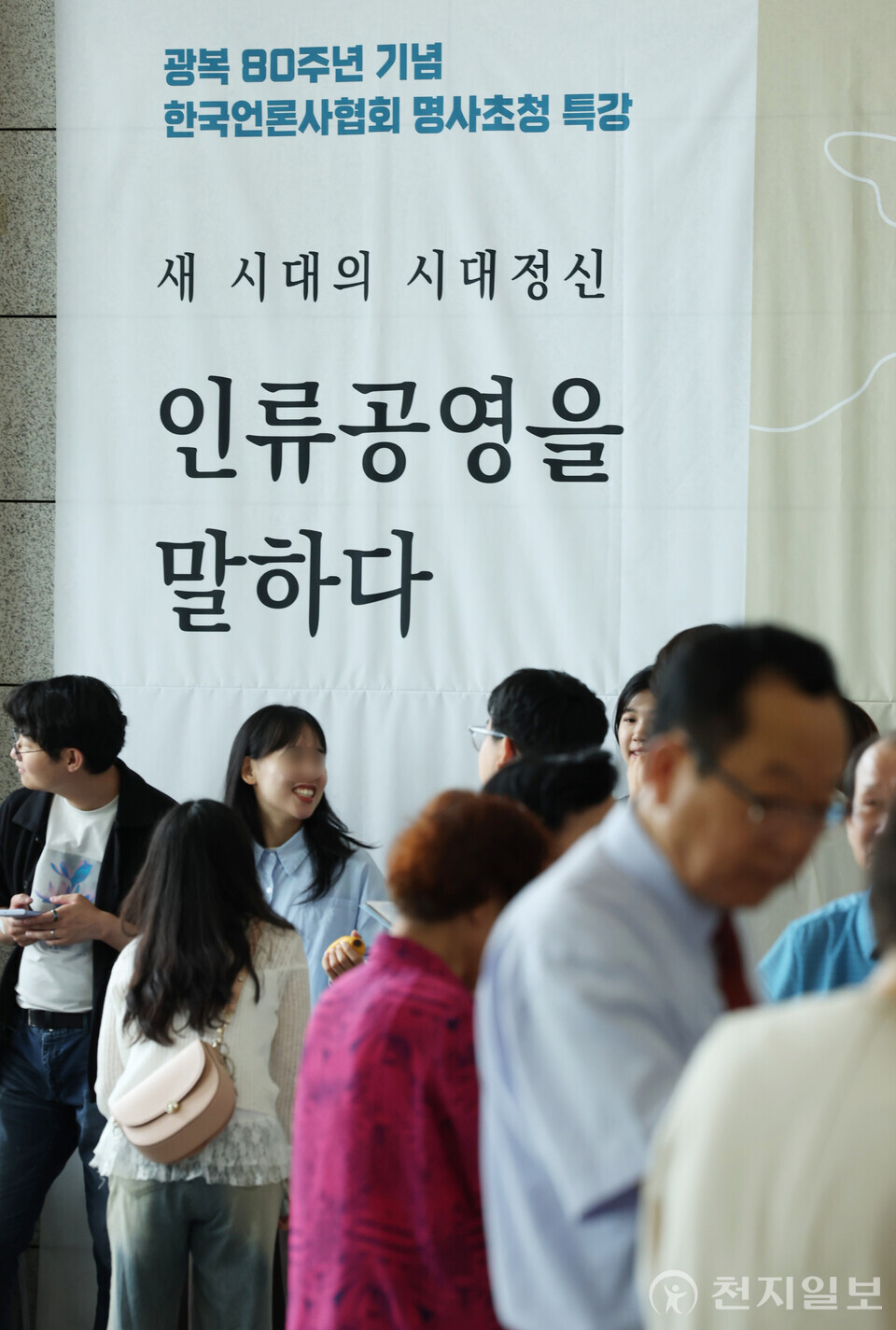 [천지일보=이시문 기자] 18일 오후 서울에서 한국언론사협회가 주최하고 천지일보가 주관한 ‘광복 80주년 기념 명사초청 특강’에서 참석자들이 기다리고 있다. 이번 특강은 ‘새 시대의 시대정신 人類共榮(인류공영)을 말하다’를 주제로 진행됐다.