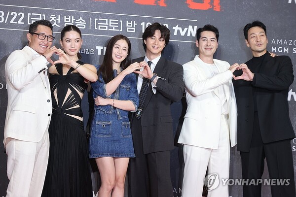 (서울=연합뉴스) 배우 대니얼 대 킴(왼쪽부터), 레이나 하디스티, 김태희, 김지훈, 션 리차드, 박해수가 18일 서울 강남구 삼성동 코엑스 메가박스에서 열린 아마존 프라임 비디오 시리즈 ‘버터플라이’ 레드카펫 행사에서 포즈를 취하고 있다.