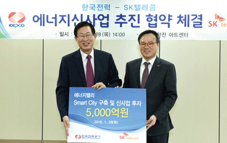 특히 양사는 2020년까지 5000억원 규모(한전 3000억, SKT 2000억)로 전기차 충전인프라 확대 등 에너지신사업에 투자하기로 합의했다. 아울러 전력과 ICT기술이 융합된 에너지신사업 분야의 사업모델 개발과 투자협력을 강화하고 해외시장 진출도 추진할 계획이다.