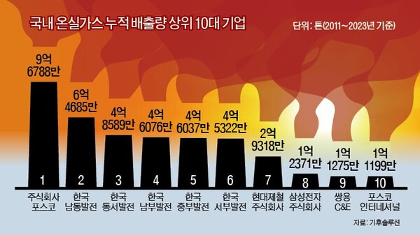 기후솔루션은 국제 학술지에 발표된 방법론을 적용해 분석한 결과 한전 발전 자회사들이 2011~2023년 배출한 온실가스로 인한 손실 기여액이 약 98조 1000억원에 달한다는 계산을 내놨다. 한전은 발전량의 95% 이상을 화력발전에 의존하고 있는데 이 가운데 석탄 발전 비중이 71.5%에 이른다. 반면 국내 신재생에너지 발전 비중은 9.5%에 불과해 공기업들이 직접 확대하기보다는 재생에너지 인증서(REC) 구매에 의존해 왔다는 지적이다.