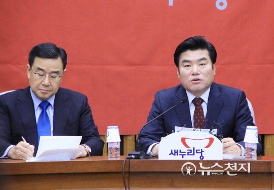 [천지일보=임문식 기자] 이른바 원샷법(기업활력제고특별법)과 북한인권법 등이 여야의 이견으로 본회의 처리가 무산된 가운데 새누리당 원유철 원내대표(오른쪽)가 2일 오전 국회에서 열린 원내대책회의에서 모두발언을 하고 있다. 왼쪽은 김정훈 정책위의장.