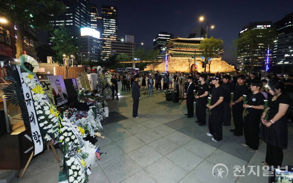 [천지일보=남승우 기자] 15일 저녁 서울 중구 숭례문 인근에 마련된 찰리 커크 분향소에서 추모식이 거행되고 있다.