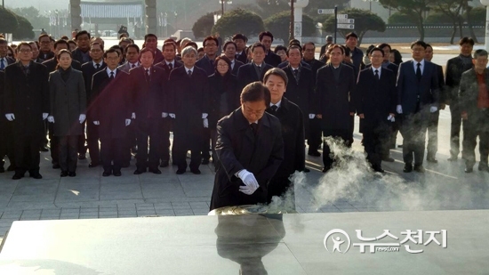 [천지일보 광주=이지수 기자] 국민의당 천정배·안철수 공동대표가 4일 오전 중앙당 창당 후 처음으로 광주를 찾아 북구 국립 5.18 민주묘지에서 희생자들의 묘역을 참배하고 있다. 천정배 공동대표가 분향을 올리고 있다.
