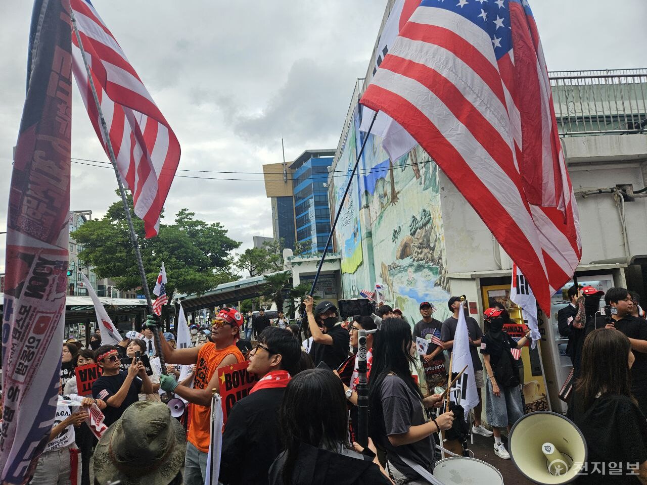 [천지일보=이재빈 기자] 청년보수단체 자유대학이 20일 제주시청 주변 어울림마당에서 중국인 무비자 입국 반대 집회 ‘CHINA LEE OUT! in 제주시청’을 개최했다. 사진은 집회 참가자들이 행진하는 모습. ⓒ천지일보 2025.09.20.