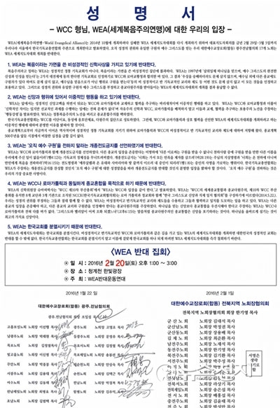 이들은 4일 모 일간지에 성명을 내고 한국기독교총연합회(한기총)가 개최하기로 한 WEA에 대한 반대 입장을 표명했다.