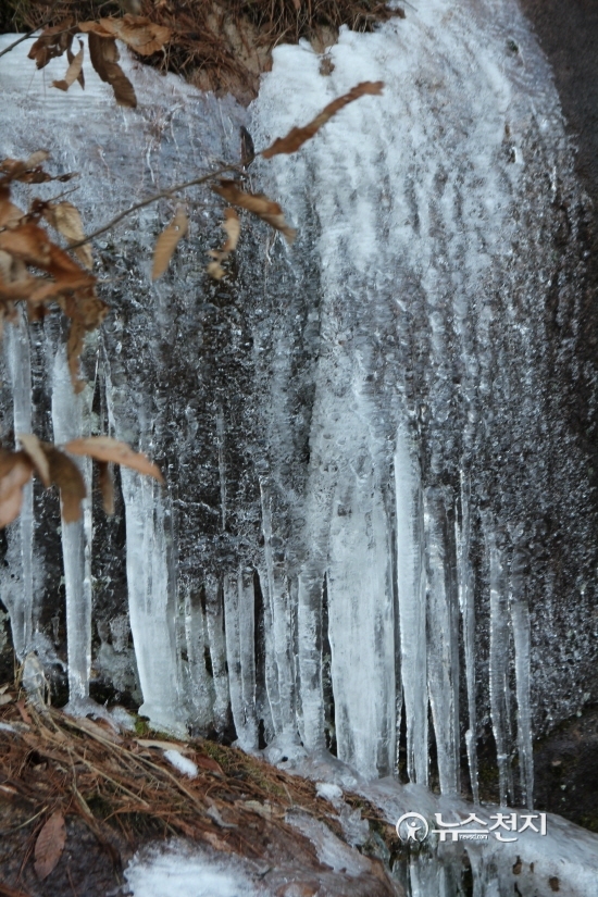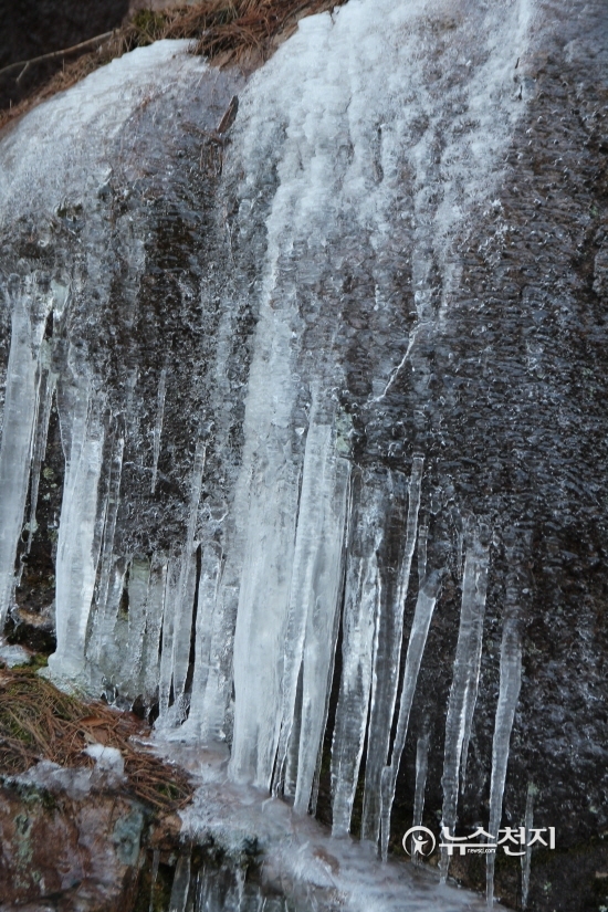 [천지일보 광주=이미애 기자] 입춘을 앞둔 지난 3일 무등산 원효사 가는 길목 바위에 얼어붙은 고드름이 마치 폭포수를 연상케 한다.