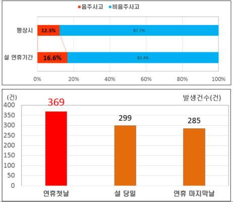 특히 연휴 첫째 날인 설 전날에 연휴기간 중 음주사고의 38.7%가 발생했다.