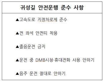 또한 귀성길 안전운행을 위한 지켜야 할 것들도 공지됐다. 이는 ▲고속도로 지정차로제 준수 ▲전 좌석 안전띠 착용 ▲졸음운전 금지 ▲운전 중 DMB시청·휴대전화 사용 안하기 등이다.