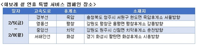 6일 한국자동차산업협회 등에 따르면 현대·기아·한국GM·쌍용·르노삼성차는 5~8일 나흘간 전국 고속도로 휴게소 24곳에 53개 서비스센터를 설치해 무상점검을 실시한다. 점검시간은 오전 9시부터 오후 5시까지 진행된다.