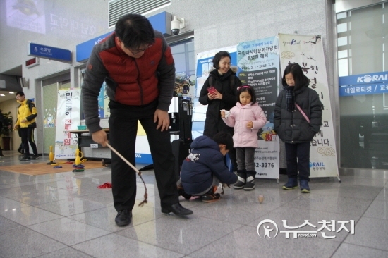 또 기차 시간을 기다리는 귀성객들을 위해 고리 던지기, 팽이 놀이, 제기차기 등 민속놀이 전통체험을 하는 모습들이 벌써부터 명절분위기로 뜨거웠다.