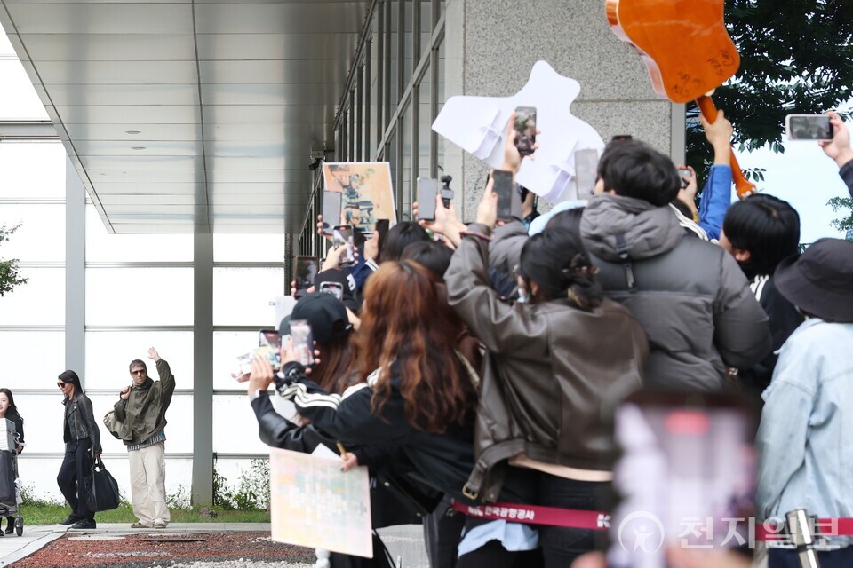 [천지일보=김정필 기자] 16년 만의 내한 공연을 앞둔 밴드 오아시스(Oasis)의 리암 갤러거(Liam Gallaghe)가 20일 오전 서울 강서구 서울김포비즈니스항공센터(SGBAC)를 통해 입국하며 팬들을 향해 인사하고 있다.