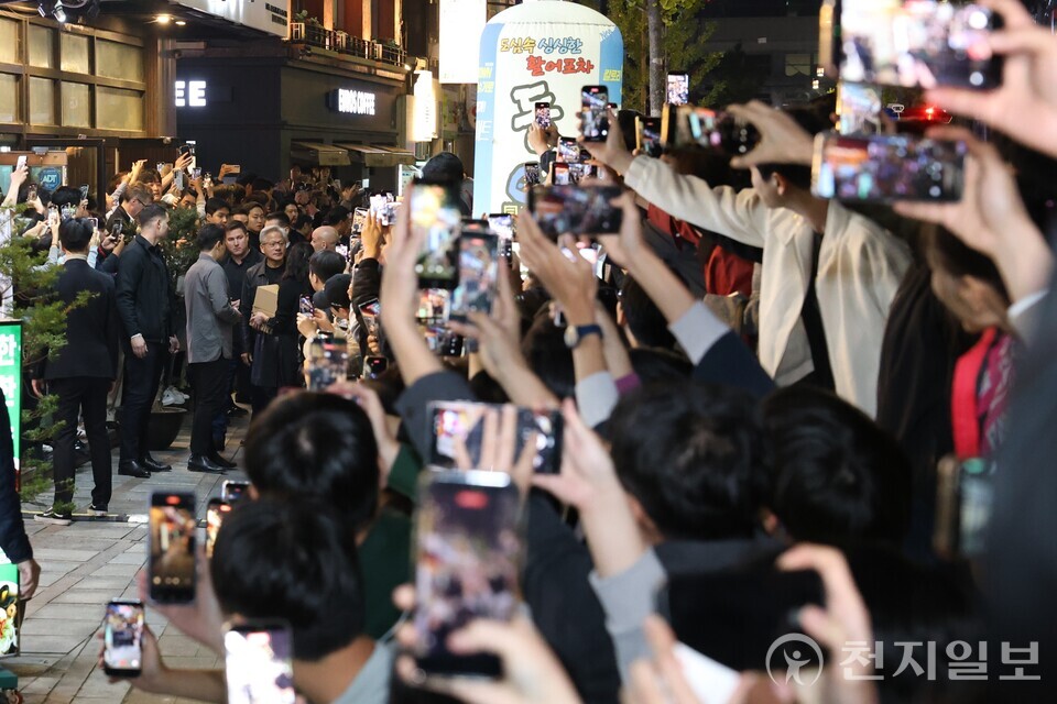 [천지일보=김정필 기자] 젠슨 황 엔비디아 최고경영자(CEO)가 30일 이재용 삼성전자 회장, 정의선 현대차그룹 회장과의 치킨 회동을 위해 서울 삼성동의 한 치킨 집으로 향하고 있다.