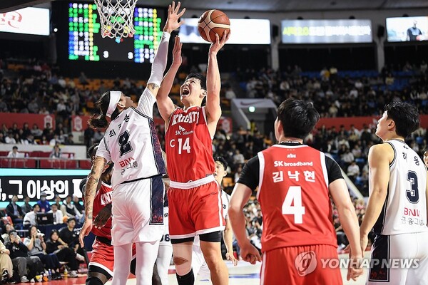 (서울=연합뉴스) 4일 서울 송파구 잠실학생체육관에서 열린 2025-2026 프로농구 KBL 서울 SK 나이츠와 부산 KCC 이지스의 경기. SK 최부경이 슛을 하고 있다. 2025.11.4