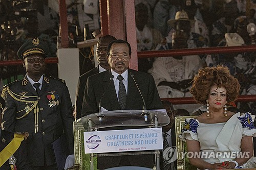 세계 최고령 국가 원수인 폴 비야(92) 카메룬 대통령이 6일(현지시간) 취임식을 열고 새 7년 임기를 시작했다. 1982년부터 43년간 집권한 비야 대통령은 건강이 허락하는 한 99세가 될 때까지 카메룬을 통치할 전망이다. 사진은 비야 대통령이 아내인 카메룬 영부인 샹탈 비야(R)와 나란히 앉아 지난달 7일 마루아에서 열린 선거 유세에서 연설하고 있다. (출처: AFP, 연합뉴스)