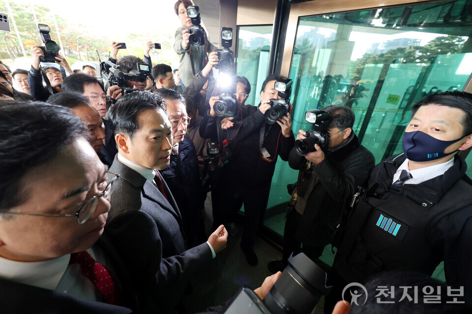 [천지일보=남승우 기자] 국민의힘 장동혁 대표와 송언석 원내대표를 비롯한 의원들이 11일 서울 서초구 대검찰청 앞에서 검찰의 대장동 개발 비리사건 항소 포기와 관련해 노만석 검찰총창 대행 사퇴를 촉구하며 항의 방문을 시도하고 있다. ⓒ천지일보 2025.11.11.