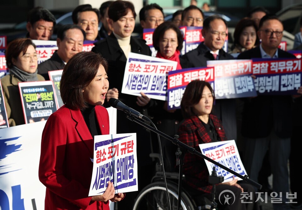 [천지일보=남승우 기자] 국민의힘 나경원 의원이 11일 서울 서초구 대검찰청 앞에서 열린 긴급 현장 규탄대회에서 검찰의 대장동 개발 비리사건 항소 포기를 규탄하며 발언하고 있다.