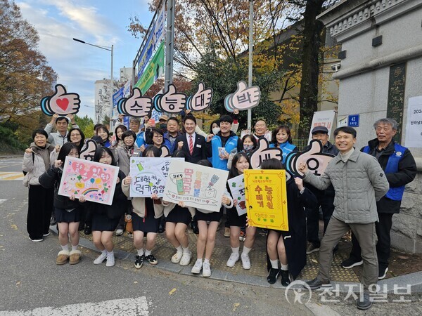 [천지일보 순천=최수아 기자] 2026학년도 대학수학능력시험이 치러진 13일 아침 전남 75지구 제203시험장인 순천강남여자고등학교 앞에서 시민과 학부모, 학생들이 수험생들에게 응원의 메시지를 보내고 있다.