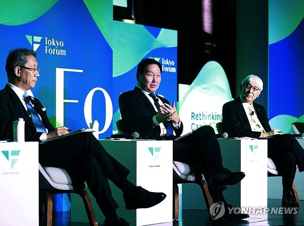 (서울=연합뉴스) 최태원 SK그룹 회장이 21일 일본 도쿄대에서 열린 '도쿄포럼 2025'에서 패널로 참석해 발언하고 있다. 2025.11.21.