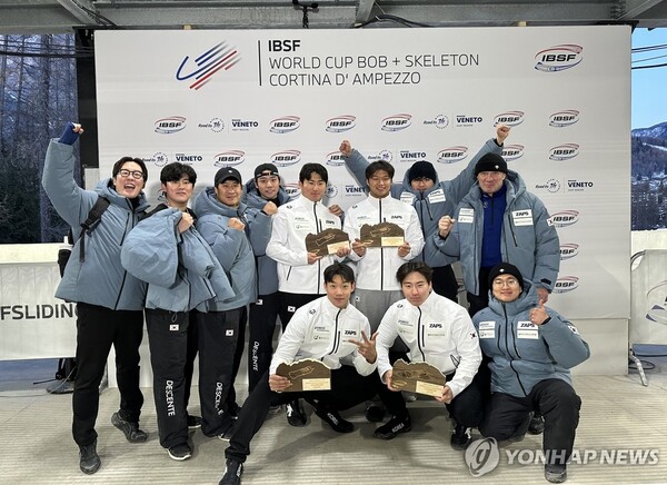 파일럿 김진수와 푸시맨 김형근(강원도청)·김선욱, 브레이크맨 이건우(이상 강원연맹)로 팀을 꾸린 김진수 팀은 23일(이하 현지시간) 이탈리아 코르티나담페초에서 열린 2025-2026시즌 국제봅슬레이스켈레톤연맹(IBSF) 월드컵 1차 대회 남자 4인승 경기에서 참가 팀 중 3번째로 빠른 1분50초34에 결승선을 통과했다. 사진은 기념촬영하는 봅슬레이 대표팀.
