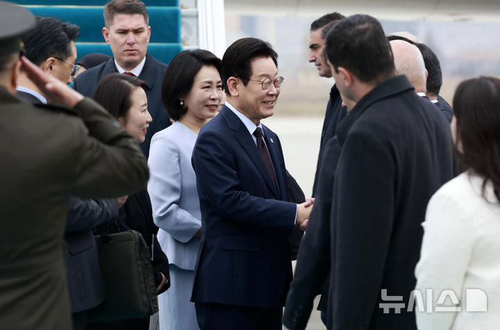 [앙카라=뉴시스] 튀르키예를 국빈 방문한 이재명 대통령이 24일(현지시간) 앙카라 에센보아 국제공항에 도착해 공군 1호기에서 내리며 환영인사들과 인사를 나누고 있다. 2025.11.24.