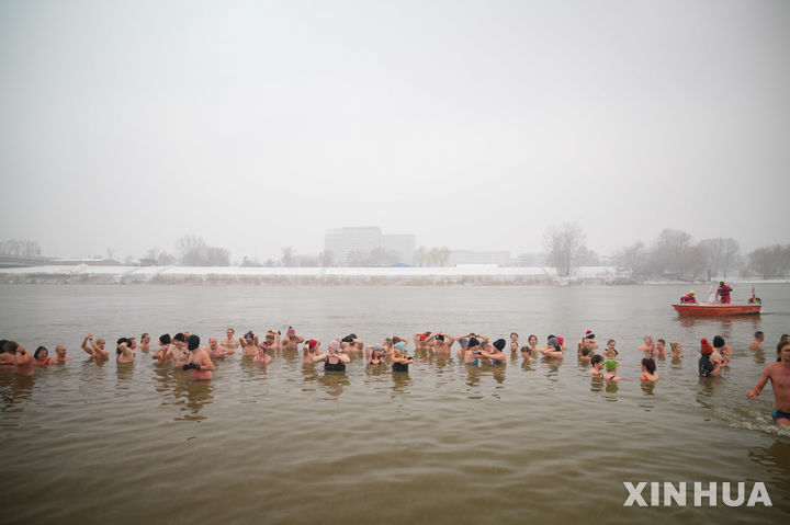 [바르샤바=신화/뉴시스] 23일(현지시간) 폴란드 바르샤바에서 겨울 수영 애호가들이 한파 수영 시즌 개막일을 맞아 내리는 눈을 맞으며 폴란드 젖줄, 비스와강 얼음물에 뛰어들고 있다. 2025.11.24.