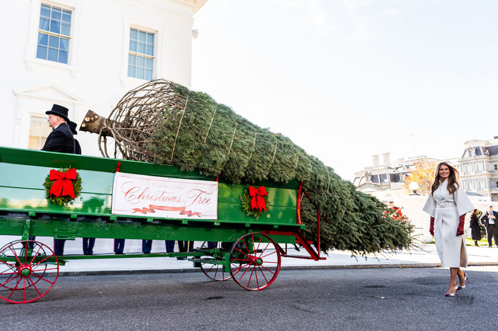 [워싱턴=AP/뉴시스] 도널드 트럼프 미국 대통령의 부인 멜라니아 여사가 24일(현지시간) 백악관 북쪽 현관에 도착한 2025 공식 백악관 크리스마스트리를 맞이하고 있다. 높이 약 7m의 이 전나무는 미시간주 코슨스 트리 농장에서 온 것으로 크리스마스트리 협회가 주최한 전국 크리스마스트리 경연에서 우승을 차지했다. 2025.11.25.