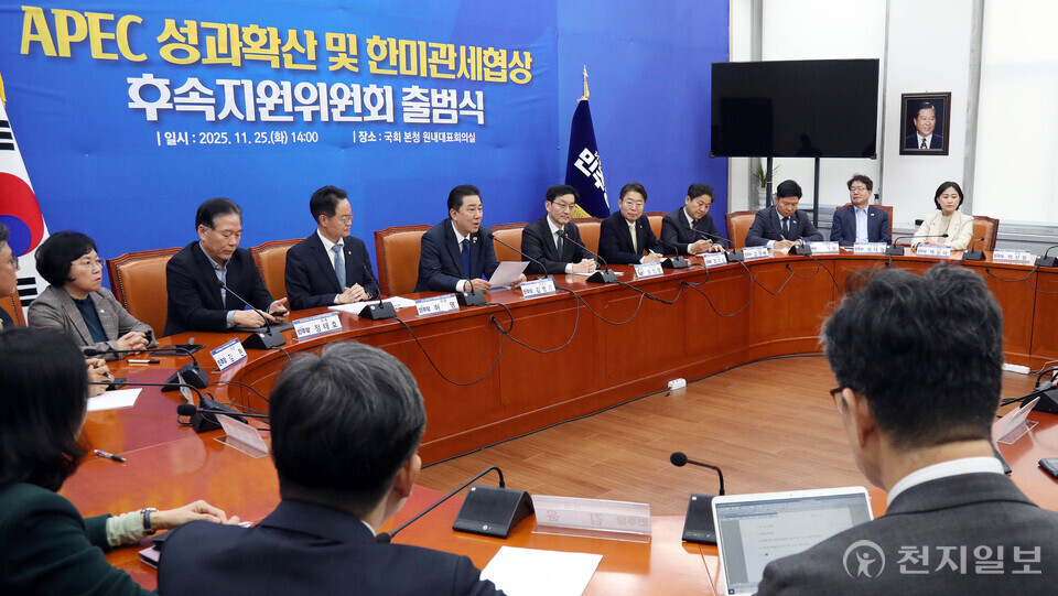 [천지일보=박준성 기자] 더불어민주당 김병기 원내대표가 25일 서울 여의도 국회에서 열린 APEC 성과확산 및 한미관세협상 후속지원위원회 출범식에서 발언을 하고 있다.