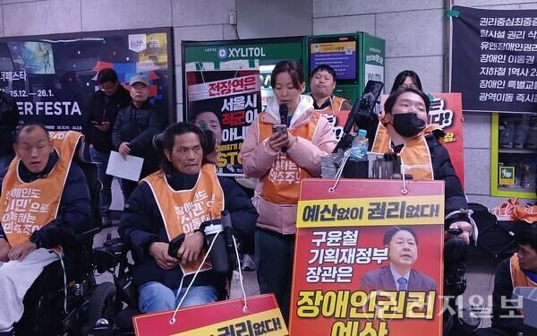 [천지일보= 배서윤 기자] 전국장애인차별철폐연대(전장연)가 25일 오후 서울 중구 시청역 승강장에서 ‘출근길 지하철 탑니다’ 시위의 연장선인 ‘12345 지하철행동(25차)’ 집회를 열고 있다.