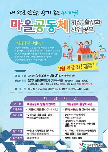 [천지일보 광주=김태건 수습기자] 광주시 북구(송광운 구청장)가 마을공동체 활성화 및 행복한 지역공동체 구현을 위해 ‘2016 마을공동체 지원 사업’을 공모한다.