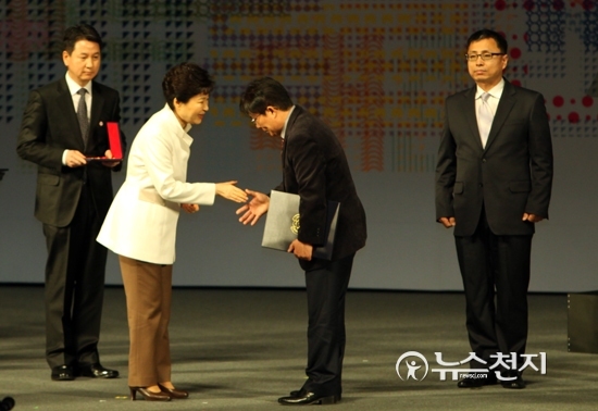 [천지일보=김민아 기자] 박근혜 대통령이 1일 서울 종로구 세종문화회관에서 열린 제97주년 3.1절 기념식에 참석해 독립유공자 후손에게 건국훈장을 수여하고 있다.