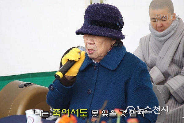 [천지일보·천지TV=황금중 기자] 충남 아산 신정호 광장에서 열린 ‘평화의 소녀상 제막식’에서 일본군 위안부 피해자 강일출 할머니를 만났다.