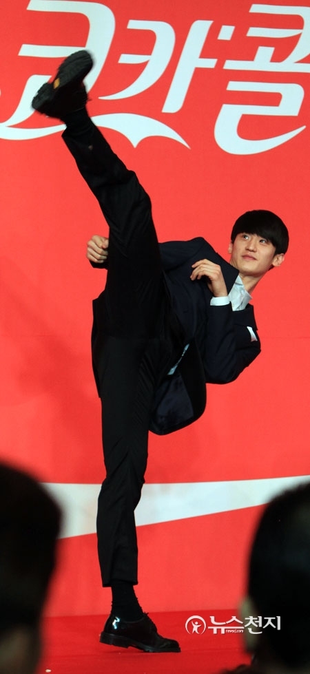 [천지일보=박혜옥 기자] 16일 서울 더플라자호텔 그랜드볼룸에서 열린 ‘제21회 코카콜라 체육대상’ 시상식에서 우수선수상을 수상한 태권도 선수 이대훈이 세리머니를 하고 있다.