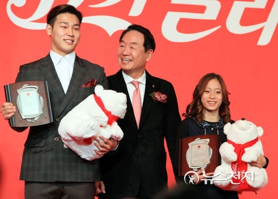 [천지일보=박혜옥 기자] 스켈레톤 윤성빈(왼쪽) 선수와 피겨스케이팅 유영(오른쪽) 선수가 16일 서울 중구 더플라자호텔에서 열린 ‘제21회 코카콜라 체육대상’에서 신인상을 수상한 뒤 기념촬영을 하고 있다.