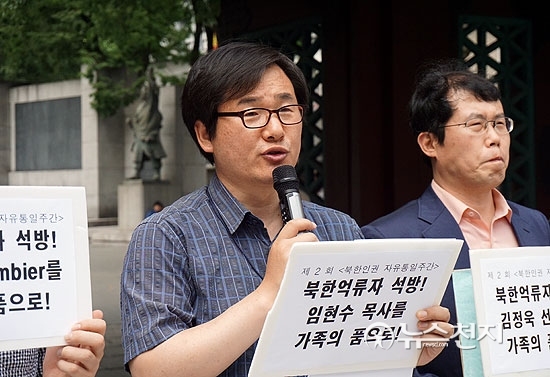 [천지일보=박완희 인턴기자] 선민네트워크와 생명과인권디아코니아 등 시민단체가 북한인권자유통일주간인 28일 오후 서울 종로 탑골공원 앞에서 북한억류자 석방기원 삼일문 집회를 연 가운데 선민네트워크 상임대표인 김규호 목사가 발제를 하고 있다.