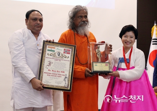 [천지일보=강은영 기자] 김남희 세계여성평화그룹(IWPG) 대표가 19일 오후 경기도 가평군 HWPL 평화연수원에서 열린 ‘마핫마 간디 비폭력 평화상 시상식 및 평화협약식’에서 간디 비폭력 평화상을 받고 기념촬영을 하고 있다.