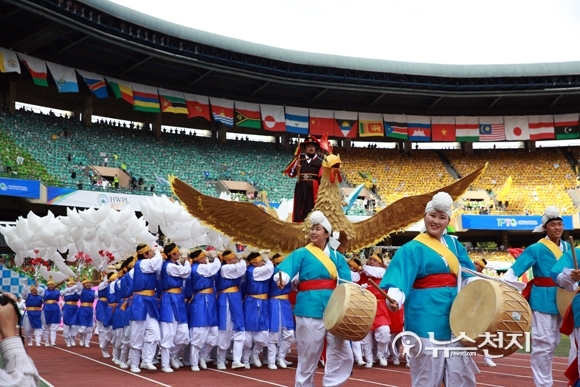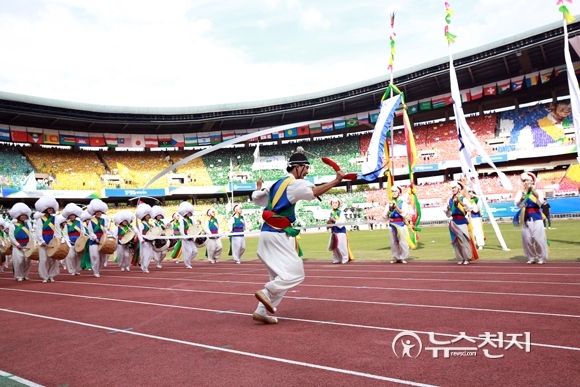 ▲ 청도 차산 농악대가 18일 ‘9.18 국제법 제정 종교대통합 만국회의(WARP: World Alliance of Religions Peace Summit) 2주년 기념 평화축제’에서 공연을 하고 있다. ⓒ천지일보(뉴스천지)