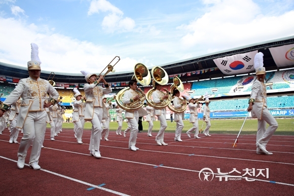 ▲ HWPL 서울경기북부 회원들이 18일 ‘9.18 국제법 제정 종교대통합 만국회의(WARP: World Alliance of Religions Peace Summit) 2주년 기념 평화축제’에서 마칭 밴드를 통해 ‘전쟁종식 세계평화’를 알리는 행진을 하고 있다. ⓒ천지일보(뉴스천지)