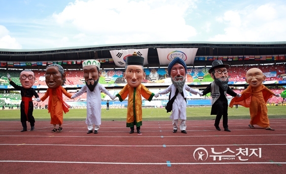 ▲ ‘9.18 국제법 제정 종교대통합 만국회의(WARP: World Alliance of Religions Peace Summit) 2주년 기념 평화축제’에서 천주교, 불교, 시크교, 이슬람교, 유대교, 도교, 힌두교 등 각 종교의 탈인형 퍼포먼스가 진행되고 있다. ⓒ천지일보(뉴스천지)