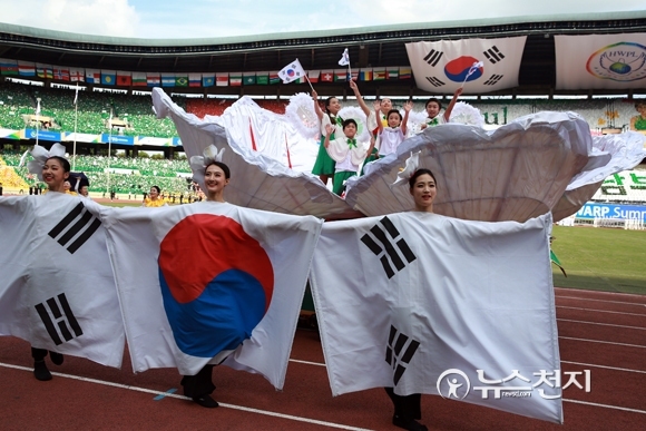 [천지일보=박준성 기자] ㈔하늘문화세계평화광복(대표 이만희, HWPL)이 주최하고 ㈔세계여성평화그룹(대표 김남희, IWPG)과 국제청년평화그룹(김두현 부장, IPYG)이 주관한 ‘9.18 국제법 제정 종교대통합 만국회의(WARP: World Alliance of Religions Peace Summit) 2주년 기념 평화축제’가 18일 오후 서울 잠실올림픽주경기장에서 열린 가운데 HWPL 국내지부와 국제부가 퍼레이드를 벌이고 있다.