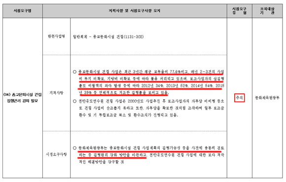 예결위는 올해 심사보고서를 통해 문체부 종교문화시설 건립 사업의 저조한 집행률을 지적했다. 문체부에 ‘종교문화시설 건립’에 대한 집행관리가 미비한 점이 있다고 판단해 ‘주의’ 조치를 내렸다.