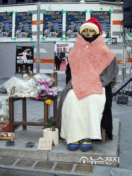 [천지일보=강병용 기자] 올해 마지막 ‘일본군 ‘위안부’ 문제 해결을 위한 정기 수요시위’가 28일 오전 서울 종로구 일본대사관 앞에서 열린 가운데 설치된 소녀상에 목도리와 털모자·동절기 의류가 입혀져 있다.
