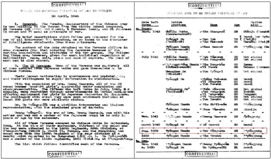 실제로 미국 NARA에서 발굴한 쿤밍 포로심문 보고서를 보면, 포로수용소에는 조선인 25명(여성 23명, 남성 2명)이 구속됐는데 조선인 가운데 10명은 송산 지역의 위안소에서 체포된 ‘위안부’들이었으며, 13명은 등충의 위안소에 있었던 ‘위안부’들이었다. 쿤밍 포로심문 보고서의 포로 명단 가운데 박영심의 이름이 명확히 표기돼 있다.
