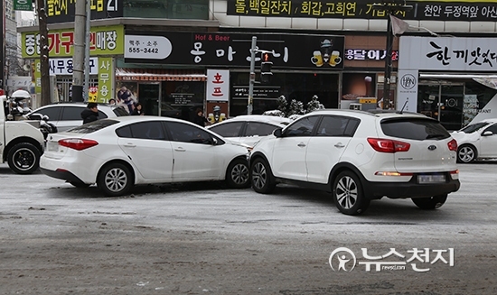[천지일보 천안=박주환 기자] 충남 천안지역에 대설 예비특보가 내려진 가운데 20일 오전 8시 40분께 두정동의 한 도로에서 눈길에 차가 미끄러지며 3중 추돌 사고가 발생했다.