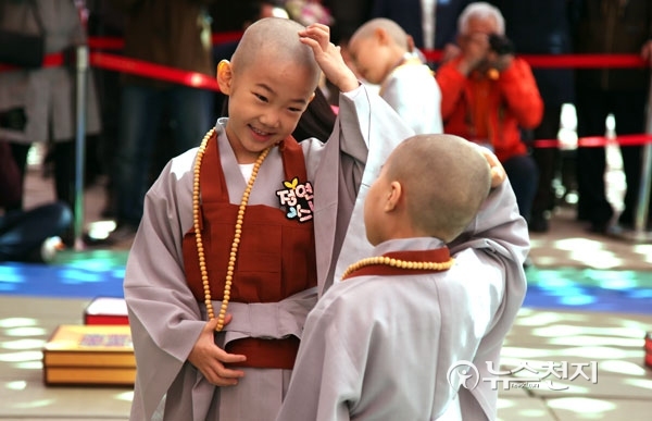 [천지일보=차은경 기자] 부처님 오신날을 앞두고 19일 서울 종로구 조계사 대웅전 앞마당에서 열린 ‘동자승 단기출가 보리수 새싹학교 삭발·수계식’에서 삭발을 마친 동자승들이 머리에 손을 대고 서로를 바라보고 있다.