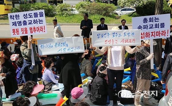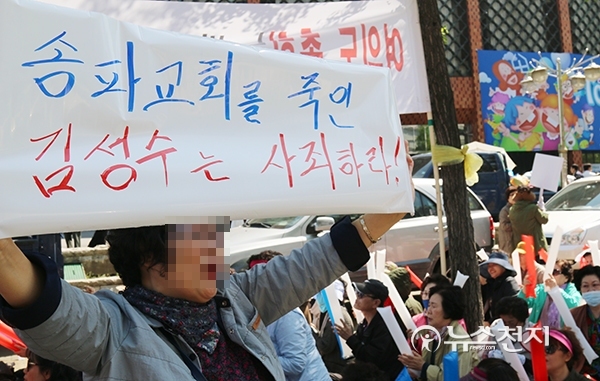 여의도순복음교회 베다니광장 앞 인도에 자리를 잡은 송파교회 교인 300여명은 “당회인준 앞두고 도망친 김성수 목사는 사죄하라” “송파교회를 죽인 김성수 목사는 사죄하라” “(기하성) 총회는 송파교회를 간섭하지 마라” “이게 교회냐” “로열패밀리 김성수 목사는 사죄하라” “착한 성도들을 제명·출교하는 못된 짓을 멈추어라” 등의 손팻말을 들고 시위를 펼쳤다. 여의도순복음교회 일부 교인들이 삿대질을 하며 언성을 높이기도 했지만 양측 간 충돌은 빚어지지 않았다.